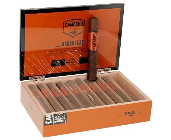 The Camacho Broadleaf is handcrafted in Honduras using Ecuadorian Habano, Ecuadorian Connecticut, Connecticut Broadleaf Maduro, Honduran Corojo wrapper, Honduras binder, and Honduras, Dominican Republic, Nicaragua filler tobaccos.