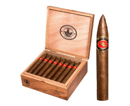 The Foreign Affair Belicoso 6X54 delivers rich notes of cedar and pepper. As it develops, leather, cocoa emerge, creating a complex and satisfying profile.