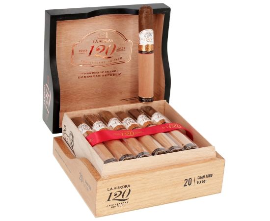 The La Aurora 120th Ann Gran Toro delivers rich notes of cedar and leather. As it develops, pepper, cocoa emerge, creating a complex and satisfying profile.