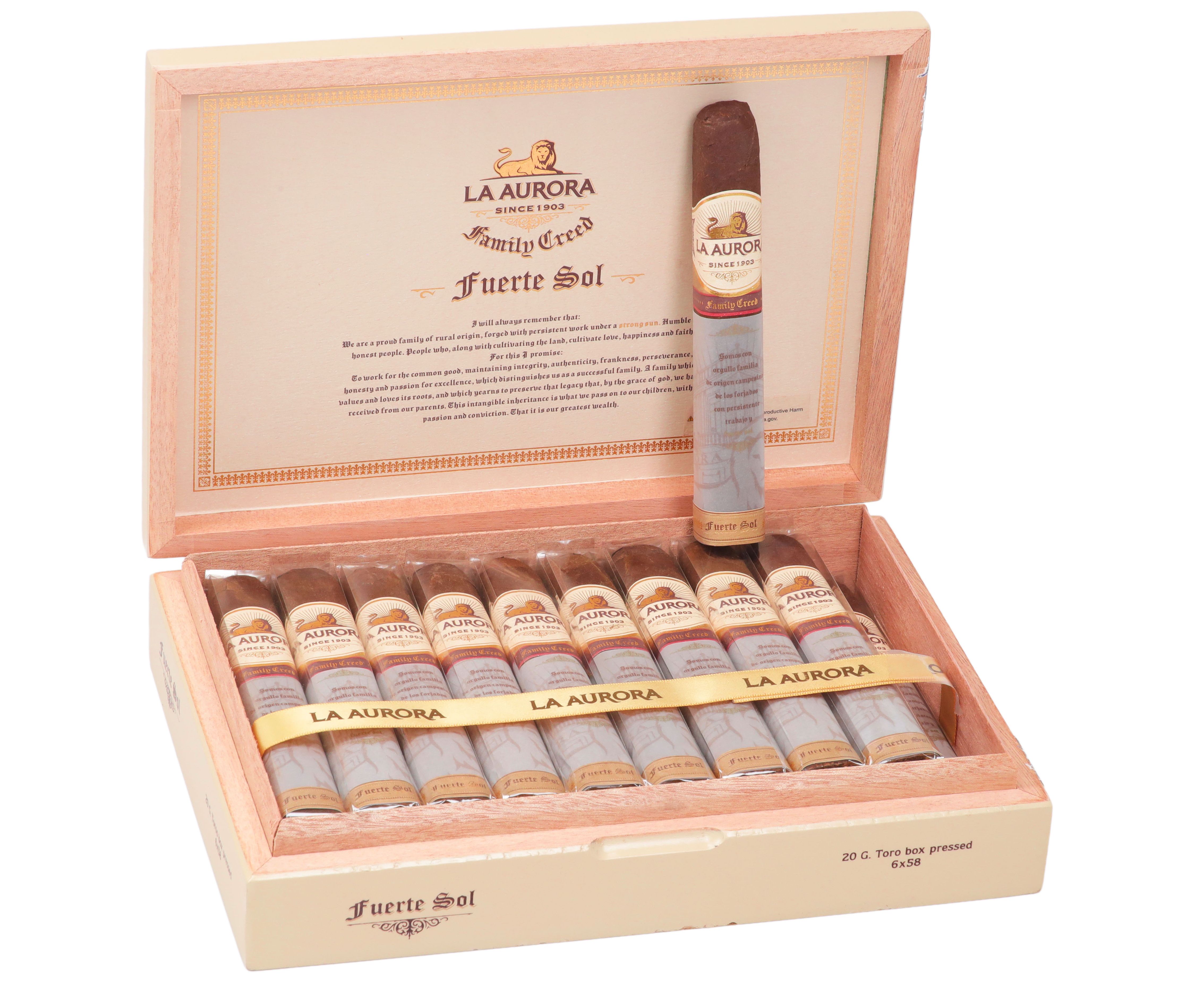 The La Aurora Family Creed Fuerte Sol Toro's full profile pairs excellently with single malt scotch, aged bourbon, or a robust port.