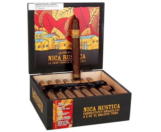 At 6 inches with a 52 ring gauge, the Nica Rustica Broadleaf El Brujito provides approximately 60-75 minutes of smoking time.