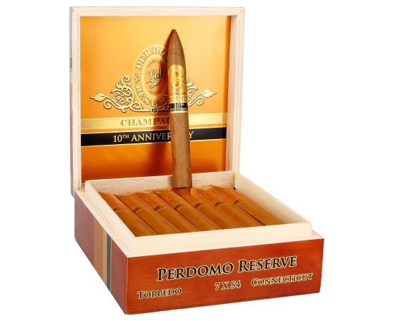 The Perdomo 10Th Ann Champagne Torpedo's medium profile pairs excellently with bourbon, aged rum, or a medium-bodied red wine.