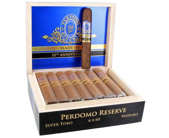 The Perdomo 10Th Ann Maduro Super Toro's medium profile pairs excellently with bourbon, aged rum, or a medium-bodied red wine.