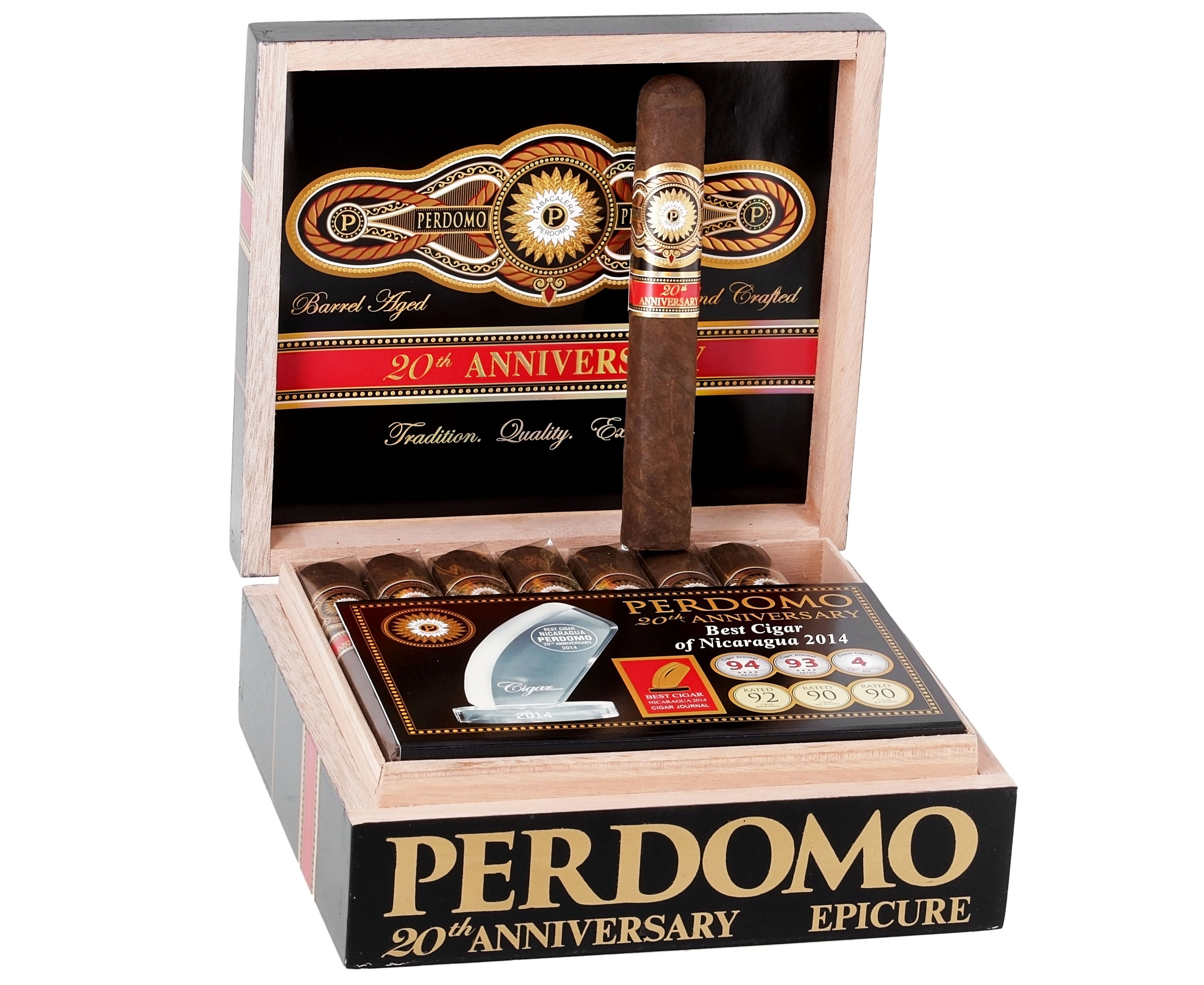 The Perdomo 20Th Ann Maduro Epicure is a 20th Anniversary blend from Perdomo with extensively aged tobaccos. From the first light, this cigar opens with cedar and leather. As it develops, layers of pepper and cocoa emerge, creating a complex and satisfying profile. The smoke is smooth and well-balanced throughout. Wrapped in Ecuadorian Connecticut, Ecuadorian Habano, Connecticut Broadleaf Maduro wrapper over Nicaragua binder and Nicaragua filler, the Epicure delivers medium-full strength with bold, nuanced flavors. Handcrafted in Nicaragua, this cigar showcases expert blending and superior construction. The Toro measures 6 inches with a 56 ring gauge, offering approximately 60-75 minutes of smoking time. This cigar pairs beautifully with aged rum, bourbon, or a full-bodied red wine.