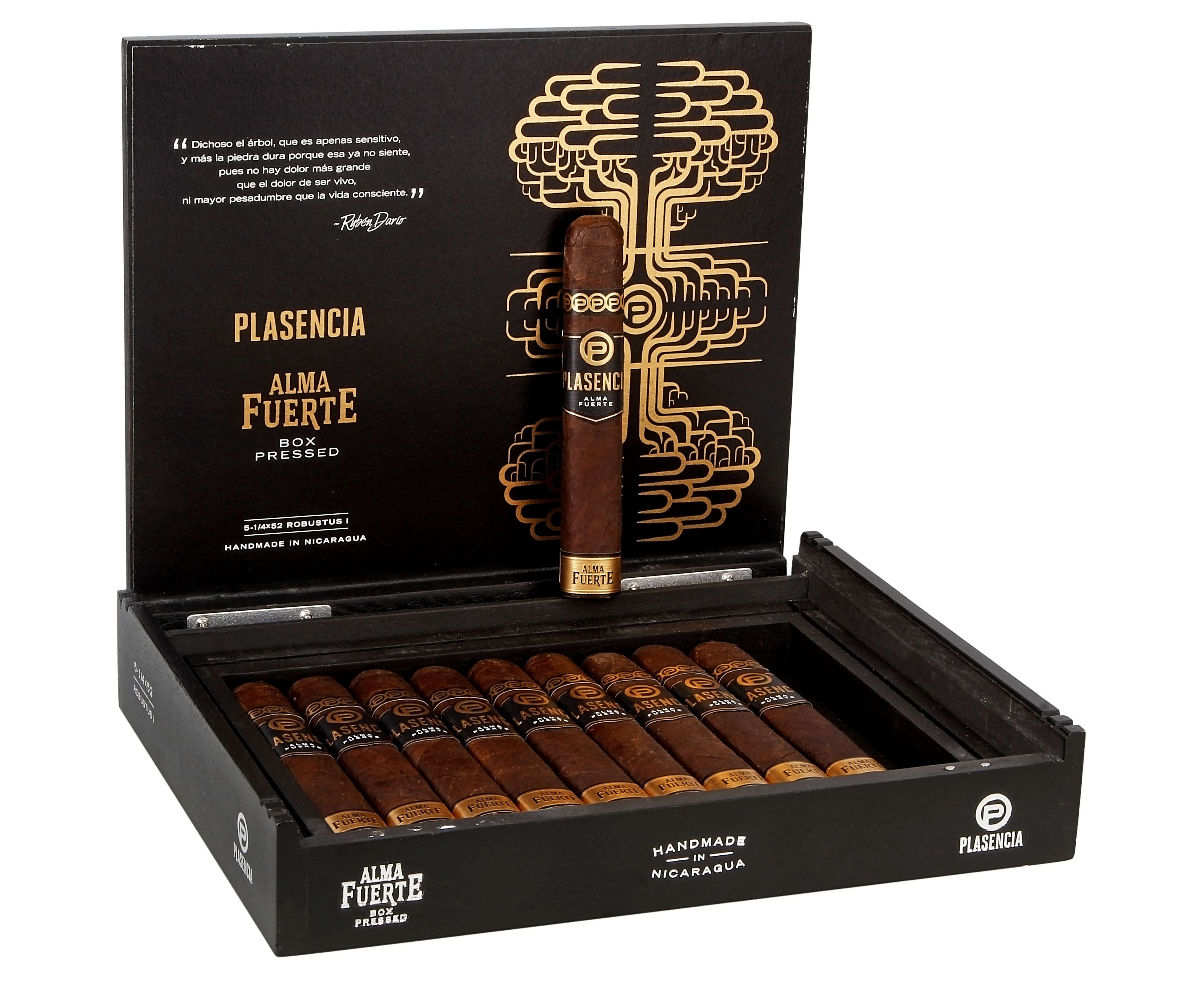 The Plasencia Alma Fuerte Robustus I 5-1/4X52 delivers rich notes of pepper and leather. As it develops, espresso, dark chocolate emerge, creating a complex and satisfying profile.