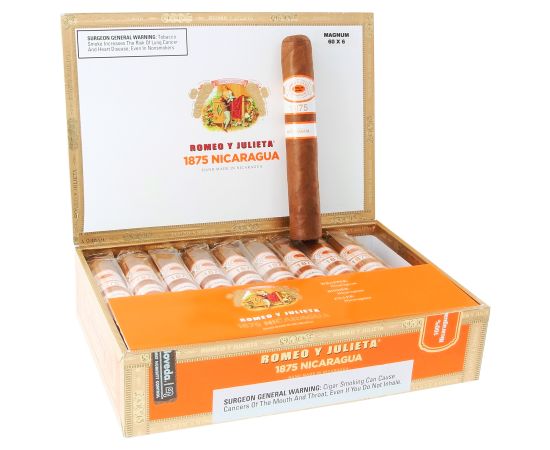 The Romeo Y Julieta 1875 Nicaragua Magnum 60X6's mild-medium profile pairs excellently with coffee, light rum, or a smooth bourbon.
