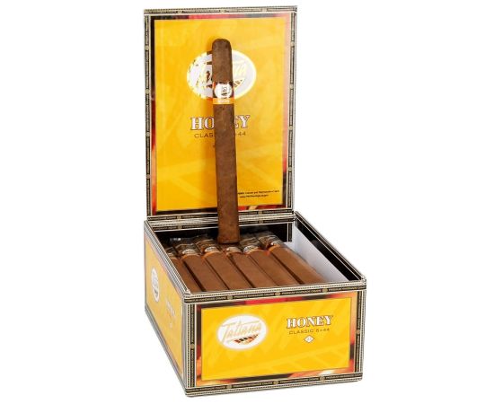The Tatiana Honey-Classic is a flavored Dominican cigar line offering a variety of sweet taste profiles in a classic format. From the first light, this cigar opens with vanilla and honey. As it develops, layers of sweet and cream emerge, creating a complex and satisfying profile. The smoke is smooth and well-balanced throughout. Wrapped in Connecticut wrapper over Dominican Republic binder and Dominican Republic filler, the Tatiana Honey-Classic delivers a sweet, approachable strength that appeals to all palates. Handcrafted in Dominican Republic, this cigar showcases expert blending and superior construction. This cigar pairs beautifully with coffee, iced tea, or a sweet cocktail.